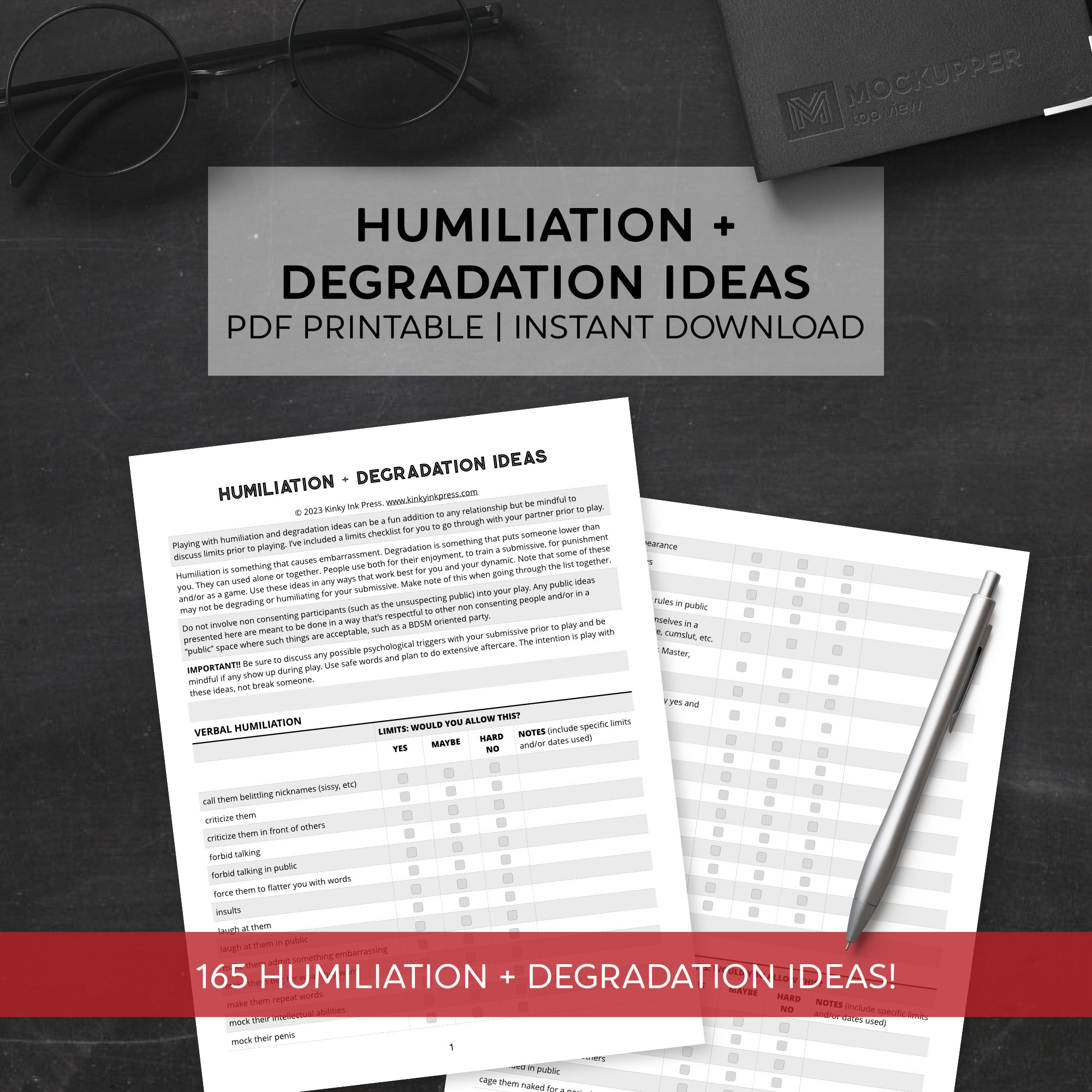 I’ve included four sections to help keep things organized and tidy when deciding which ways to humiliate and/or degrade your submissive. I’ve also included a limits checkbox for each so you can discuss each one prior to play to ensure consent.