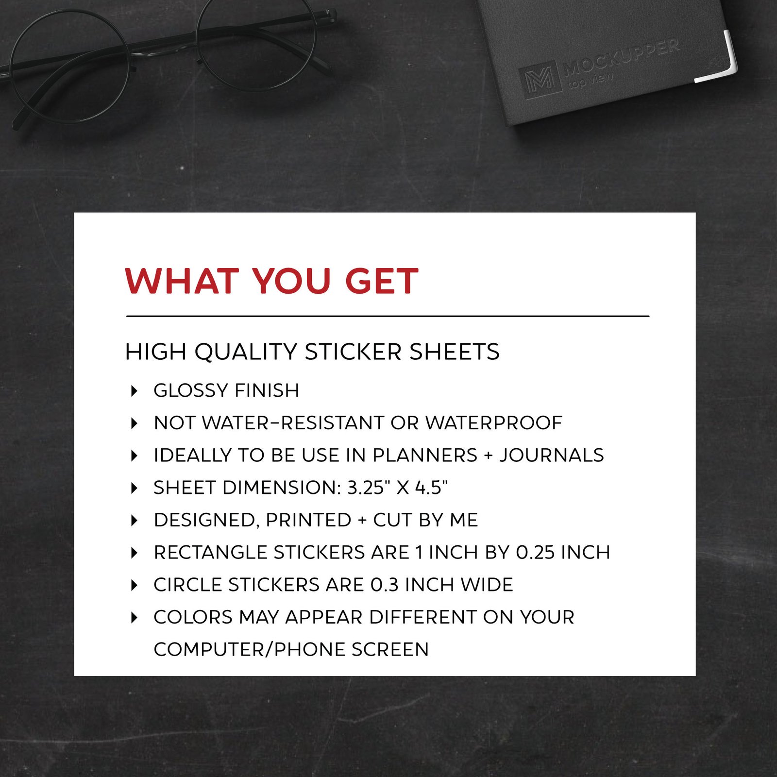 – Sticker sheet size is 3.25 inches by 4.5 inches